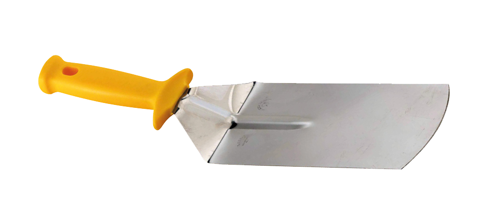 Pizzaspachtel 9 x 25 cm aus Edelstahl - mit gelben Kunststoffgriff - kg 0,2