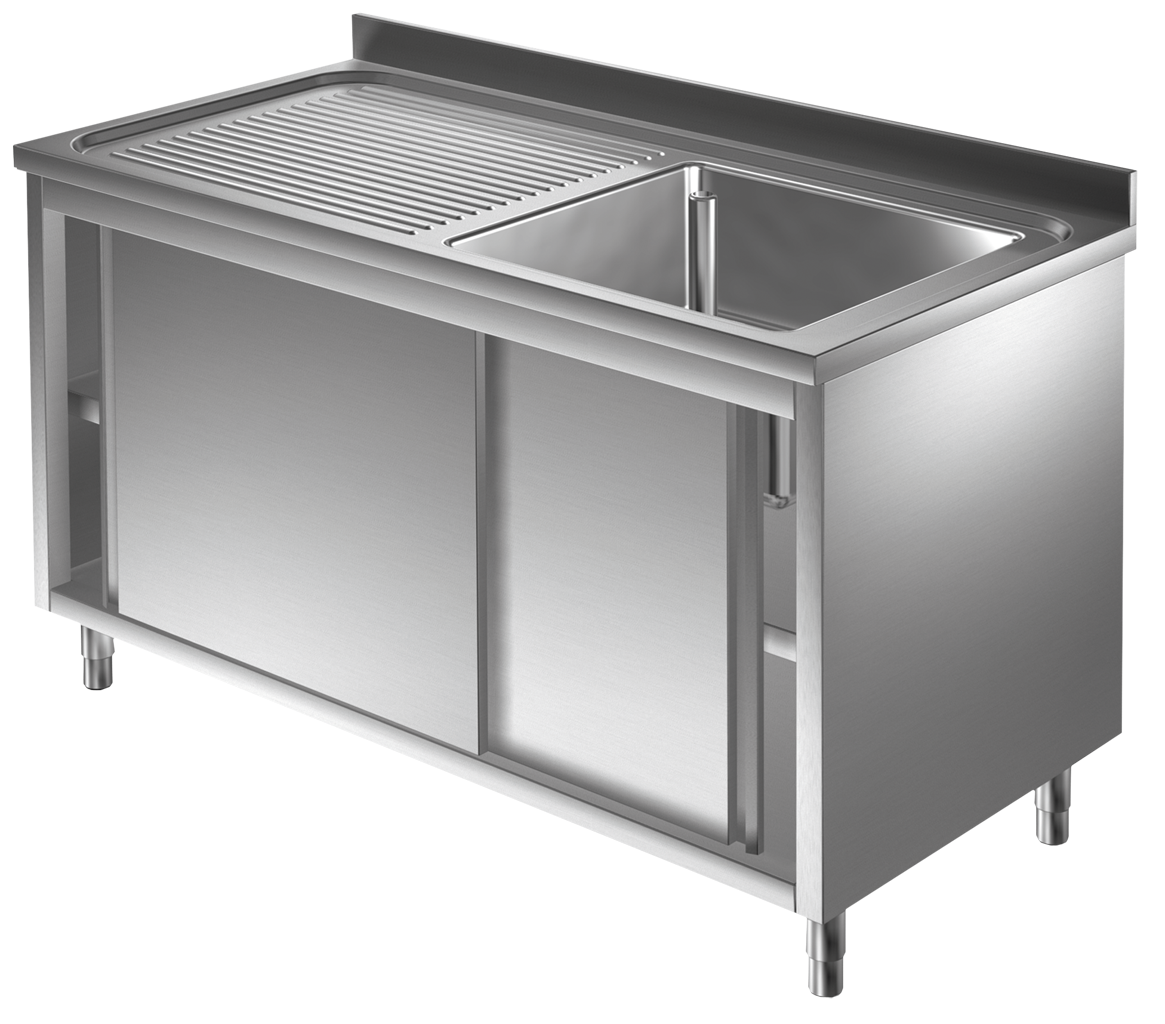 Ausführung: - Spülschrank komplett aus Edelstahl - hohe Belastbarkeit durch verschweißte Konstruktion - keine scharfen Kanten - mit höhenverstellbaren Schraubfüßen Spülabdeckung: - 1 Spülbecken rechts (BxTxH): 500 x 500 x 300 mm - Abtropffläche links - Spülabdeckung mit 100 mm Aufkantung - Materialstärke: 0,8 mm - Inkl. Standrohrventil Unterbau: - Unterbau mit doppelwandigen Schiebetüren - verstärkter Grundboden - offene Rückseite für Wasseranschluss - Bodenfreiheit: ca. 140 mm Material: - Chromstahl, nickelfrei, AISI 430, WNr. 1.4016, entspricht sämtlichen europäischen und amerikanischen Nahrungsmittel-Normen! Maße (BxTxH): 1200 x 700 x 850 + 100 mm