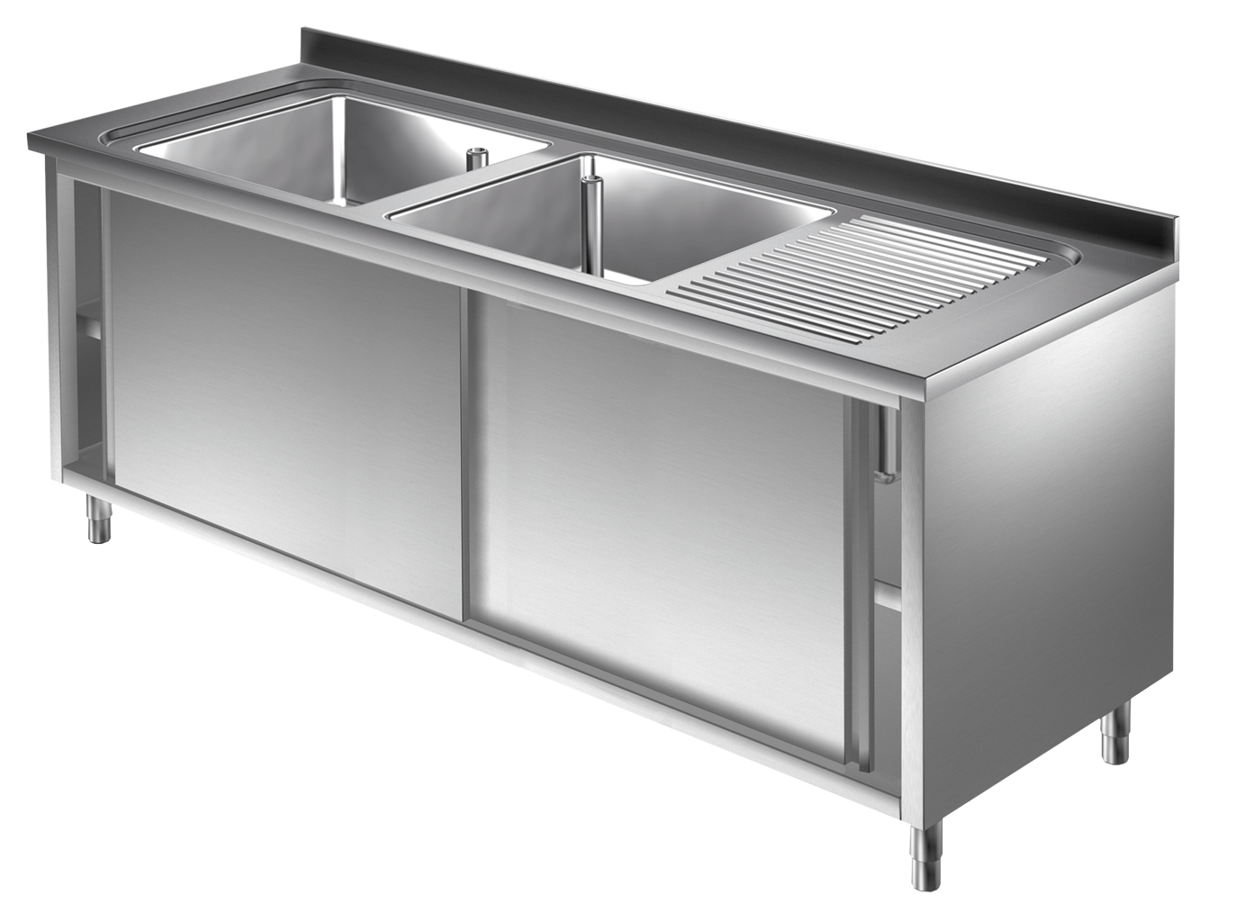 Ausführung: - Spülschrank komplett aus Edelstahl - hohe Belastbarkeit durch verschweißte Konstruktion - keine scharfen Kanten - mit höhenverstellbaren Schraubfüßen Spülabdeckung: - 2 Spülbecken links (BxTxH): 400 x 400 x 300 mm - Abtropffläche rechts - Spülabdeckung mit 100 mm Aufkantung - Materialstärke: 0,8 mm - Inkl. Standrohrventil Unterbau: - Unterbau mit doppelwandigen Schiebetüren - verstärkter Grundboden - offene Rückseite für Wasseranschluss - Bodenfreiheit: ca. 140 mm Material: - Chromstahl, nickelfrei, AISI 430, WNr. 1.4016, entspricht sämtlichen europäischen und amerikanischen Nahrungsmittel-Normen! Maße (BxTxH): 1400 x 600 x 850 + 100 mm