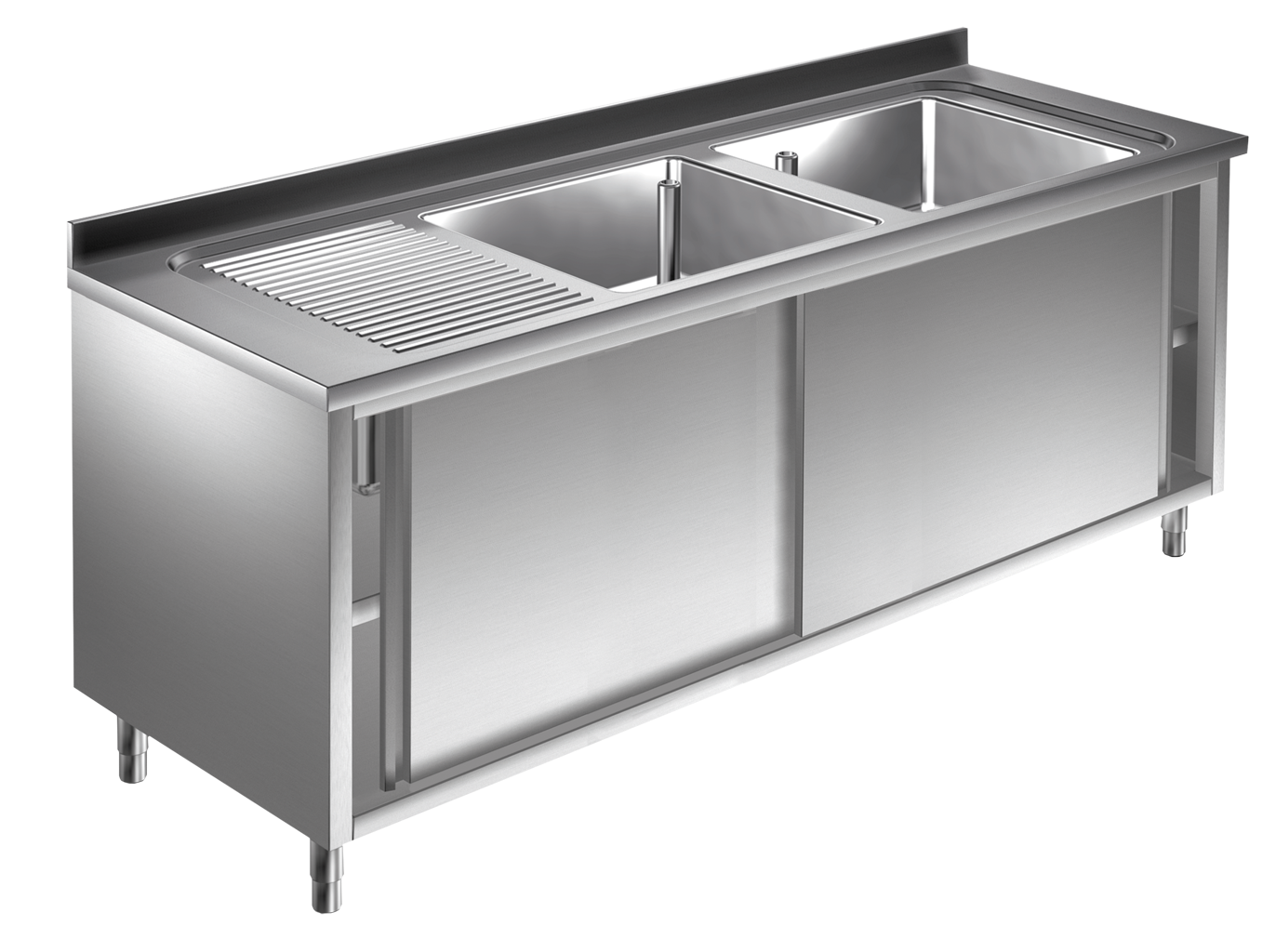 Ausführung: - Spülschrank komplett aus Edelstahl - hohe Belastbarkeit durch verschweißte Konstruktion - keine scharfen Kanten - mit höhenverstellbaren Schraubfüßen Spülabdeckung: - 2 Spülbecken rechts (BxTxH): 400 x 400 x 300 mm - Abtropffläche links - Spülabdeckung mit 100 mm Aufkantung - Materialstärke: 0,8 mm - Inkl. Standrohrventil Unterbau: - Unterbau mit doppelwandigen Schiebetüren - verstärkter Grundboden - offene Rückseite für Wasseranschluss - Bodenfreiheit: ca. 140 mm Material: - Chromstahl, nickelfrei, AISI 430, WNr. 1.4016, entspricht sämtlichen europäischen und amerikanischen Nahrungsmittel-Normen! Maße (BxTxH): 1400 x 600 x 850 + 100 mm