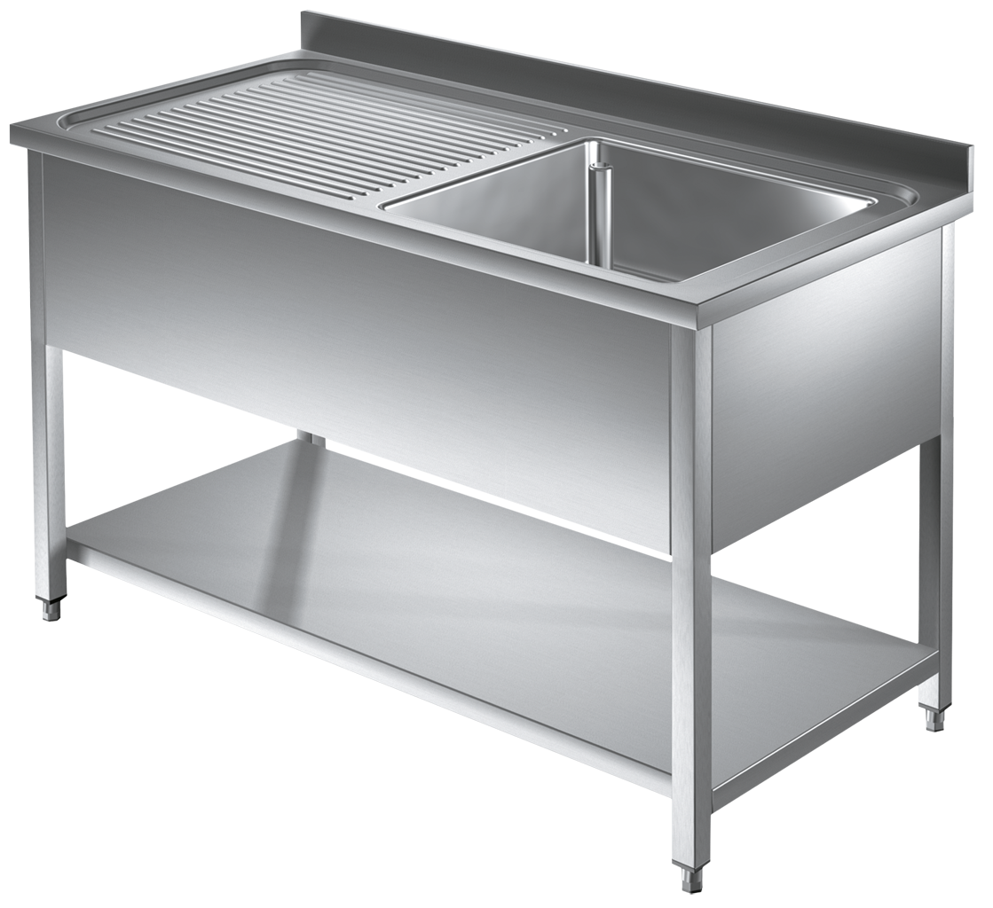 Ausführung: - Spültisch komplett aus Edelstahl - hohe Belastbarkeit durch verschraubte Konstruktion - keine scharfen Kanten - mit höhenverstellbaren Schraubfüßen Spülabdeckung: - 1 Spülbecken rechts (BxTxH): 500 x 400 x 250 mm - Abtropffläche links - Spülabdeckung mit 100 mm Aufkantung - Materialstärke: 0,8 mm - Inkl. Standrohrventil Untergestell: - Untergestell mit verstärktem Grundboden - 270 mm Front- & Seitenverkleidung unterhalb der Spülabdeckung - Lichtes Maß zwischen Grundboden und Front- bzw. Seitenverkleidung: 358 mm - Bodenfreiheit: ca. 140 mm - Grundgestell aus Vierkantprofil 40 x 40 mm, Profilstärke: 1,0 mm Material: - Chromstahl, nickelfrei, AISI 430, WNr. 1.4016, entspricht sämtlichen europäischen und amerikanischen Nahrungsmittel-Normen! Maße (BxTxH): 1200 x 600 x 850 + 100 mm Hinweis: - Der Spültisch wird demontiert, zur Selbstmontage, geliefert.