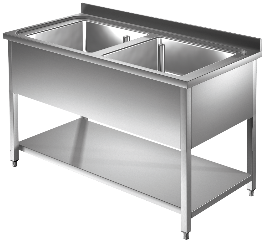 Ausführung: - Spültisch komplett aus Edelstahl - hohe Belastbarkeit durch verschraubte Konstruktion - keine scharfen Kanten - mit höhenverstellbaren Schraubfüßen Spülabdeckung: - 2 Spülbecken (BxTxH): 500 x 400 x 250 mm - Spülabdeckung mit 100 mm Aufkantung - Materialstärke: 0,8 mm - Inkl. 2x Standrohrventil Untergestell: - Untergestell mit verstärktem Grundboden - 270 mm Front- & Seitenverkleidung unterhalb der Spülabdeckung - Lichtes Maß zwischen Grundboden und Front- bzw. Seitenverkleidung: 358 mm - Bodenfreiheit: ca. 140 mm - Grundgestell aus Vierkantprofil 40 x 40 mm, Profilstärke: 1,0 mm Material: - Chromstahl, nickelfrei, AISI 430, WNr. 1.4016, entspricht sämtlichen europäischen und amerikanischen Nahrungsmittel-Normen! Maße (BxTxH): 1400 x 600 x 850 + 100 mm Hinweis: - Der Spültisch wird demontiert, zur Selbstmontage, geliefert.