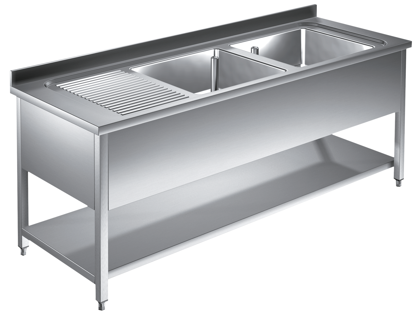 Ausführung: - Spültisch komplett aus Edelstahl - hohe Belastbarkeit durch verschraubte Konstruktion - keine scharfen Kanten - mit höhenverstellbaren Schraubfüßen Spülabdeckung: - 2 Spülbecken rechts (BxTxH): 400 x 400 x 250 mm - Abtropffläche links - Spülabdeckung mit 100 mm Aufkantung - Materialstärke: 0,8 mm - Inkl. 2x Standrohrventil Untergestell: - Untergestell mit verstärktem Grundboden - 270 mm Front- & Seitenverkleidung unterhalb der Spülabdeckung - Lichtes Maß zwischen Grundboden und Front- bzw. Seitenverkleidung: 358 mm - Bodenfreiheit: ca. 140 mm - Grundgestell aus Vierkantprofil 40 x 40 mm, Profilstärke: 1,0 mm Material: - Chromstahl, nickelfrei, AISI 430, WNr. 1.4016, entspricht sämtlichen europäischen und amerikanischen Nahrungsmittel-Normen! Maße (BxTxH): 1600 x 600 x 850 + 100 mm Hinweis: - Der Spültisch wird demontiert, zur Selbstmontage, geliefert.