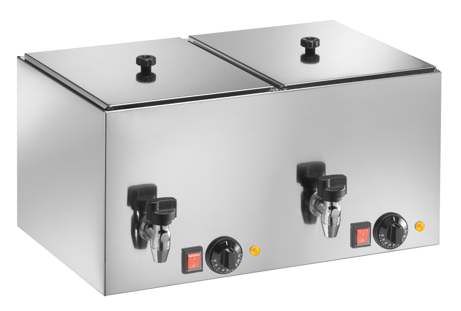 Ausführung: - Würtschenwärmer in Tischausführung - Gehäuse aus Edelstahl - 2 tiefgezogene Becken - Sicherheitsthermostate - mit Temperaturregler, Ein- / Ausschalter und Kontrollleuchten Ausstattung: - 2 abgerundetes, tiefgezogenes Becken mit 12 Liter Volumen Beckenmaß (BxTxH): 238 x 300 x 170 mm Leistung: - 2 Heizwiderständ mit je 1,0 kW - Thermostatleistung: 0°C bis 110°C Anschluss: - Anschlusswert: 2 x 1,0 kW - Elektrischer Anschluss: 230 V / 1N / 50 Hz - mit Stecker in Schuko-Bauart nach CEE 7/7 Maße (BxTxH): 560 x 350 x 290 mm