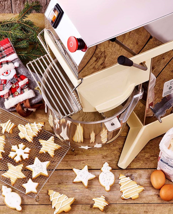 Planetenrührwerk mit 10 Liter Edelstahlschüssel und drei Werkzeugen (Knethaken, Flachrührer und Rührbesen).