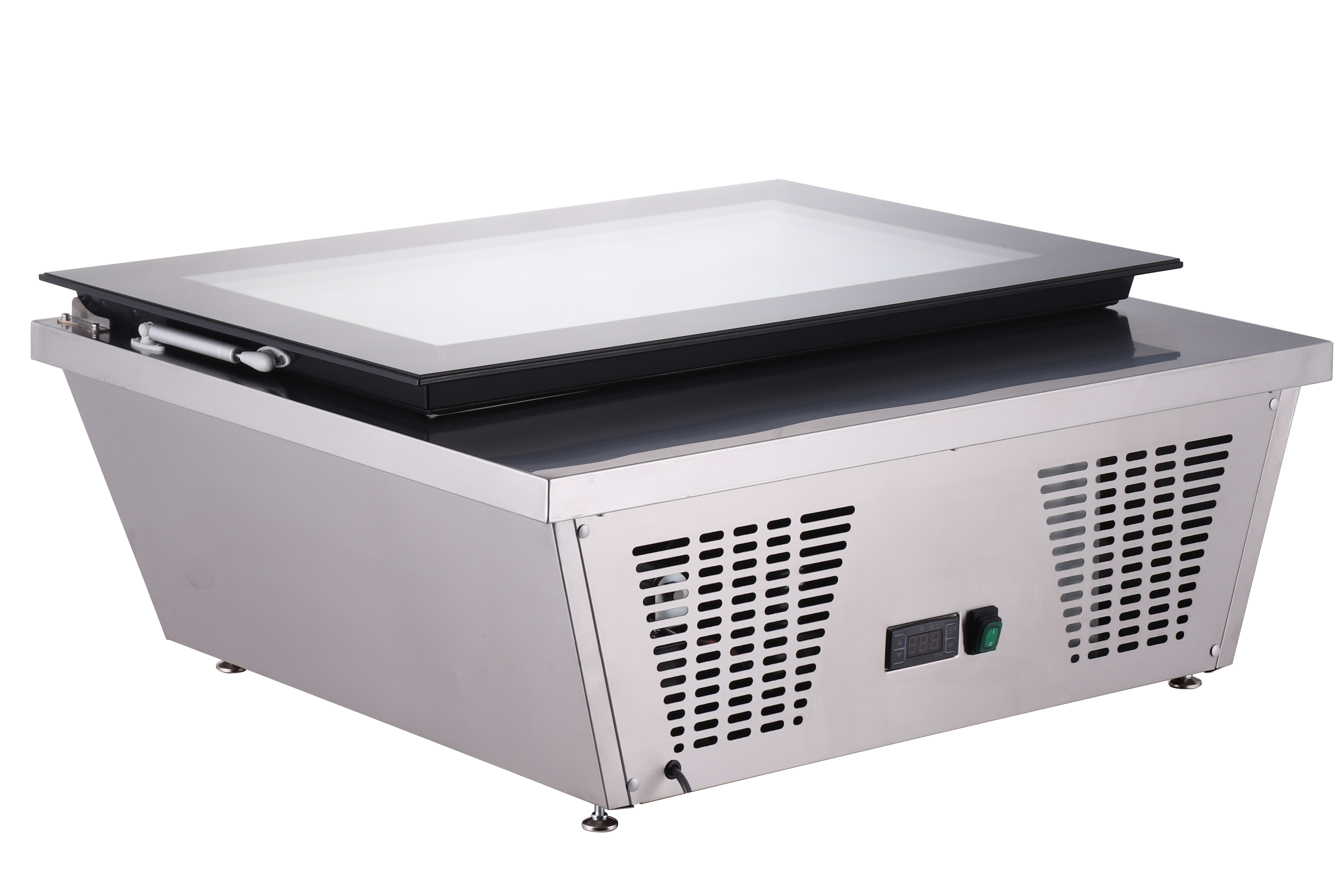 • Material: (Gehäuse) Edelstahl, (Deckel) Doppelverglasung, (Deckelrahmen) Kunststoff, schwarz,• Komplett klappbare Glasabdeckung mittels Kolben,