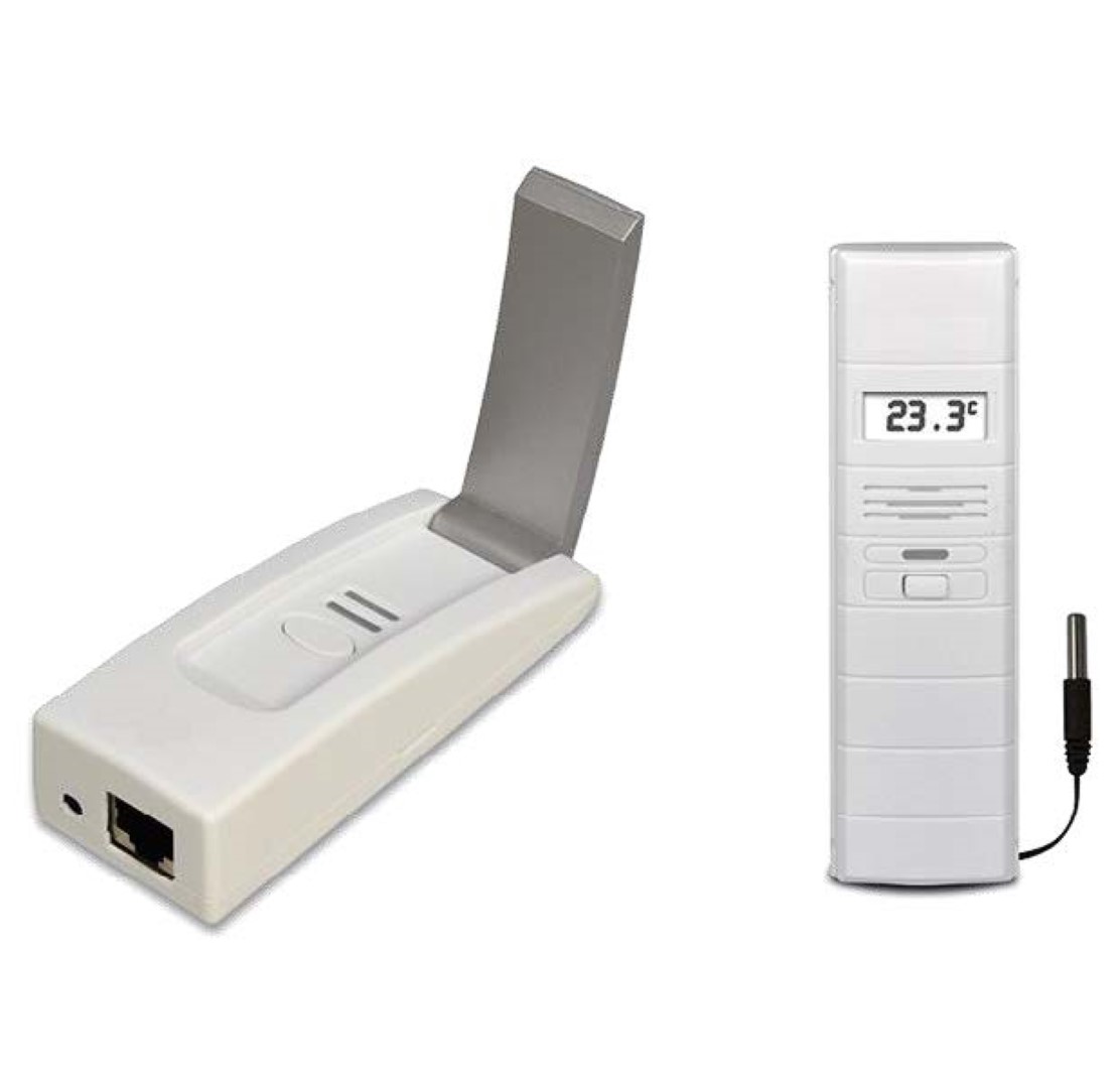 • Messeinheit für Temperatur und Luftfeuchtigkeit bestehend aus Sensor (B) und Gateway (A),•Messwerte können auf ein Smartphone (iOS/Android) oder den PC übertragen werden,