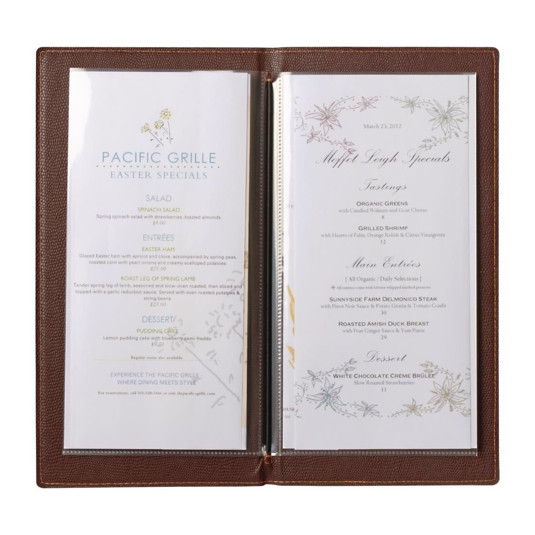 Kollektion moderner Menükartenhalter - in verschiedenen Farben und Größen erhältlich. Hergestellt aus weichem Kunstleder, zerkratzt nicht und waschbar mit Wasser und Seife. Ausgestattet mit einem Einsatz für die Anzeige von vier Seiten Rücken an Rücken.