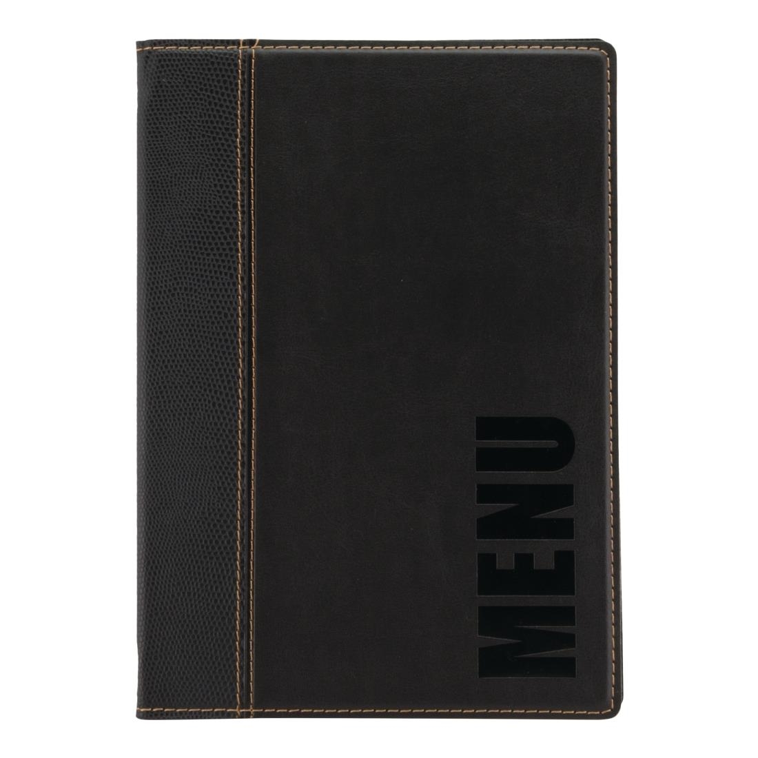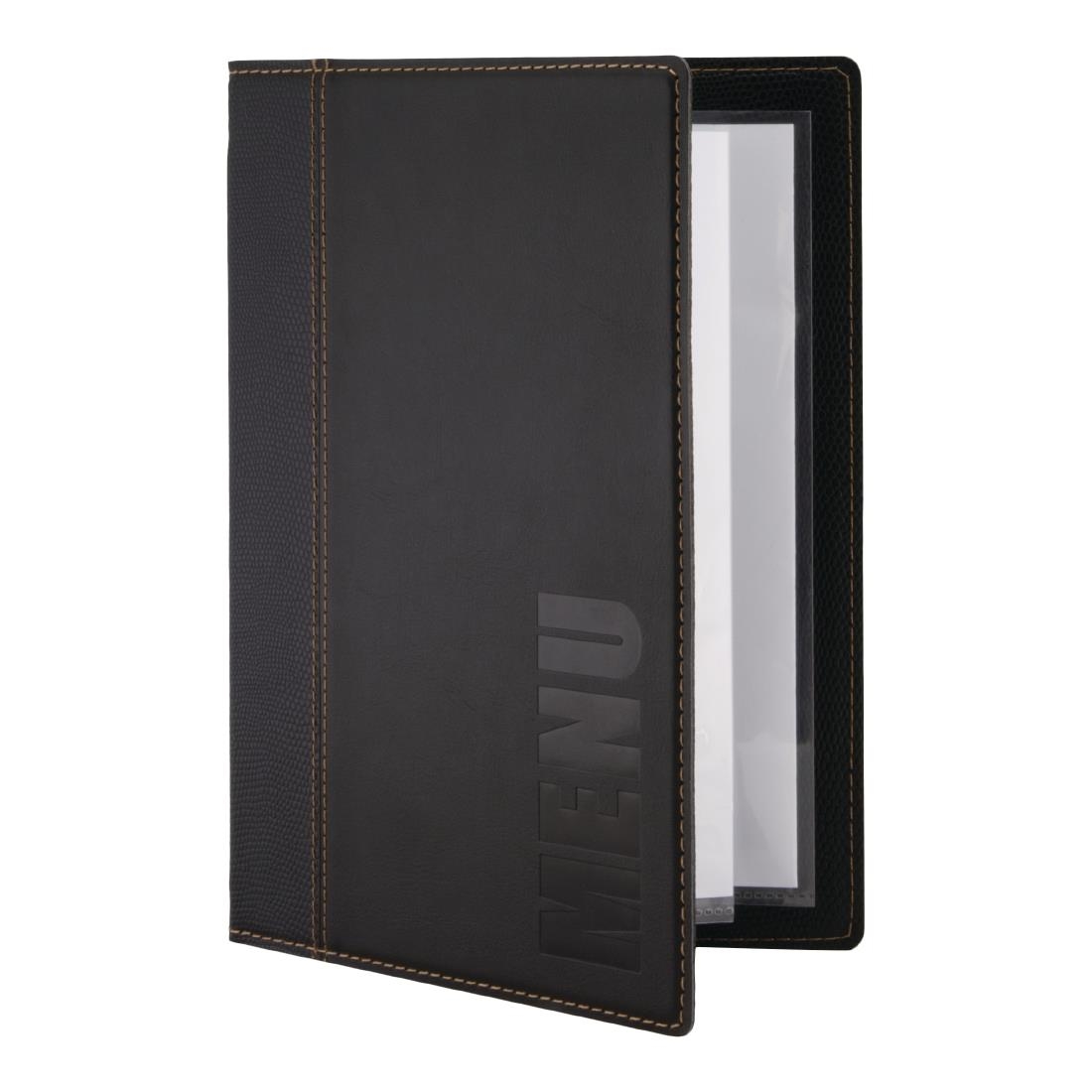 Kollektion moderner Menükartenhalter - in verschiedenen Farben und Größen erhältlich. Hergestellt aus weichem Kunstleder, zerkratzt nicht und waschbar mit Wasser und Seife. Ausgestattet mit einem Einsatz für die Anzeige von vier Seiten Rücken an Rücken.