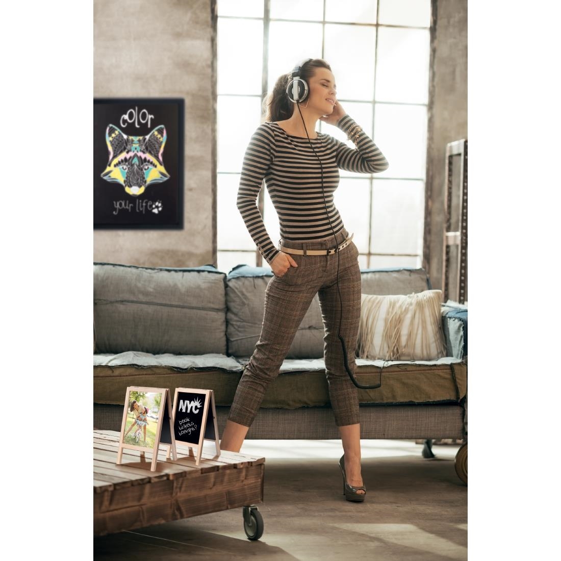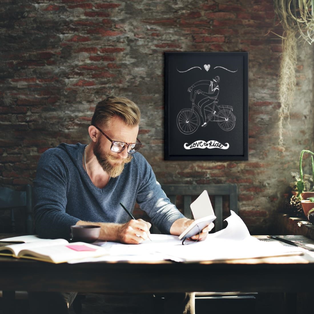 Informatives und dekoratives Medium. Modell mit schwarzem Holzrahmen. Auf beiden Seiten beschreibbar. Wird mit weißem Kreidemarker und Wandbefestigungen geliefert.