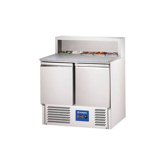 Optimaler Pizzatisch für die Grundausstattung Ihres gastronomischen Betriebes. Die Arbeitsfläche aus unverwüstlichem Granit ist kratz- und schnittfest sowie geschmacksneutral. Ihre vorbereiteten Zutaten lagern Sie griffbereit in den fünf schräggestellten GN 1/6-Behältern. Weiteren Stauraum bieten Ihnen die zwei Kühlfächer aus Edelstahl mit je einem GN 1/1 Einlegeboden. Die isolierten, selbstschließenden Türen lassen sich Mithilfe der durchgehenden Griffleiste einfach öffnen und schließen. Die Kühltemperatur können Sie in einem Bereich von +2/+8 °C manuell einstellen. Über das Bedienelement mit Digitalanzeige kontrollieren Sie ebenso die Umgebungstemperatur und starten die Abtauung. Das schlichte, zeitlose Design und die Verarbeitung von hochwertigem Edelstahl ermöglicht eine Aufstellung im Frontbereich Ihrer Gastronomie. Die Abdeckung dient hier als Spuckschutz und Ablage gleichermaßen. Die GN-Behälter sind nicht im Lieferumfang enthalten! Die Serie Starline Ihres Gastronomie-Experten Stalgast überzeugt durch solide verbaute, bewährte Komponenten in Profi-Qualität zu günstigen Preisen!