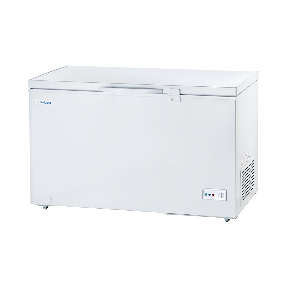Diese Tiefkühltruhe für den professionellem Bedarf ist benutzerfreundlichen und verfügt über eine starke Isolierung, um unnötigen Energieverlust zu verhindern. Mittig der leicht schräggestellten Deckelfront ist der praktische, lange Griff sowie das Schloss auf guter Arbeitshöhe angebracht. Das geräumige Gefrierfach mit LED-Innenbeleuchtung bietet mit 354 Litern Nettorauminhalt viel Platz für Ihre Waren. In dem praktischen, verschiebbaren Einhängekorb können Sie kleines Gefriergut einsortieren, damit es schnell auffindbar und griffbereit ist. An der Vorderseite finden Sie den Thermostatregler sowie die Betriebsleuchten. Die Steuerung erfolgt elektronisch. Das Gerät steht sicher auf vier Rollen, um die Tiefkühltruhe bei Bedarf leicht umstellen zu können. Zur Reinigung können Sie die Tiefkühltruhe manuell abtauen, das Tauwasser kann dazu über den Abfluss komfortable abfließen. Anschließend lassen sich das pflegeleichte Gehäuse sowie der Innenraum unkompliziert ab-/auswischen. Wir empfehlen Ihnen, die Tiefkühltruhe von einem Fachmann installieren zu lassen!