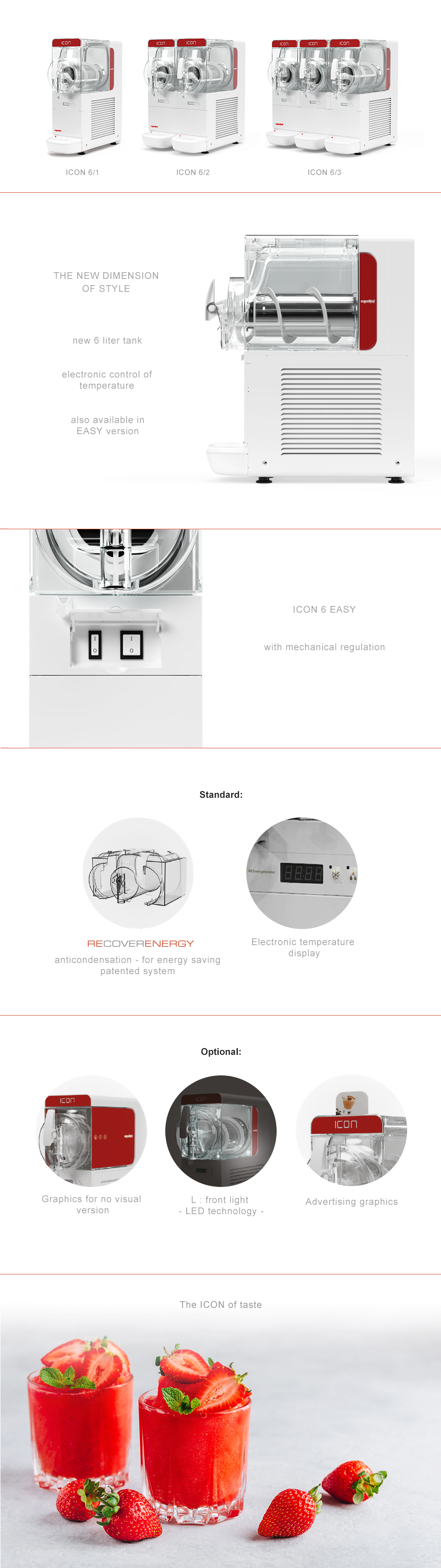 Innovatives Design trifft auf modernste Technik Mit 2,8 Litern Fassungsvermögen macht der ICON eine gute Figur in jeder Location. Dabei präsentiert er Ihre Marke werbewirksam. Die kompakte Serie ermöglicht es nun jedem leckere Frozen Drinks, Frozen Joghurts oder Smoothies anzubieten.
