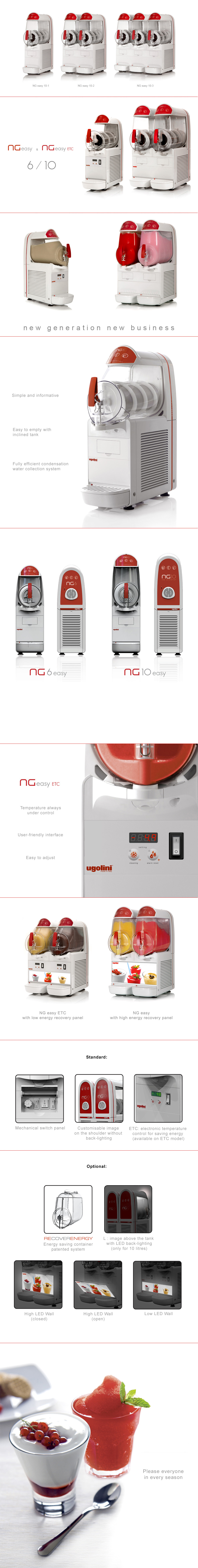 Der NG easy ist äußerst kompakt und ermöglicht die Zubereitung von Slushes, Sorbets, kalten Cremes und Cocktails. Mit einer Behältergröße von 10 oder 6 Litern ist er in zwei Konfigurationen erhältlich. Beide Varianten sind kompatibel mit dem innovativen Behälterschutz „Recover-Energy“ zur optimalen Energieeinsparung.