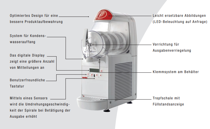 Innovatives Design trifft auf modernste Technik Mit 2,8 Litern Fassungsvermögen macht der ICON eine gute Figur in jeder Location. Dabei präsentiert er Ihre Marke werbewirksam. Die kompakte Serie ermöglicht es nun jedem leckere Frozen Drinks, Frozen Joghurts oder Smoothies anzubieten.