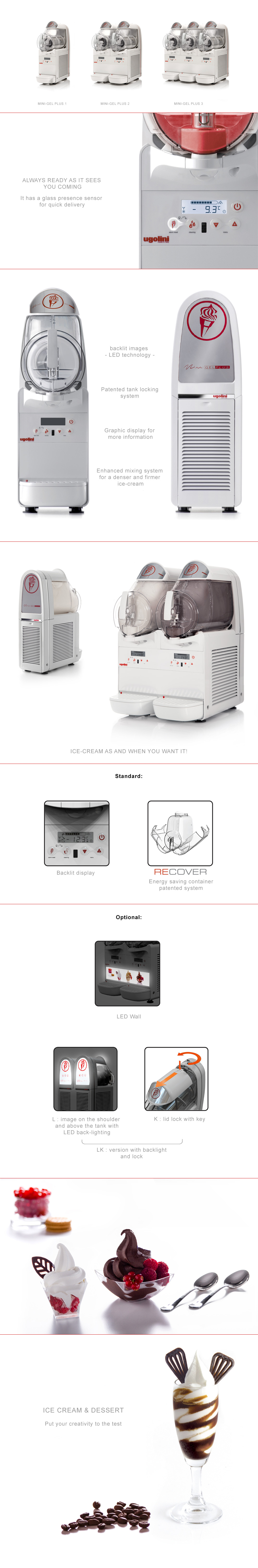 Der Minigel Plus wurde ganz speziell zur Herstellung von Frozen Joghurt und Eiscremespezialitäten entwickelt. Die digitale Steuerung ermöglicht die stufenlose Regulierung der Einstellungen und so auch die Herstellung von Slush und Sorbet. Zusätzliche Funktionen wie der automatische Nachtbetrieb oder ein Sensor, der eine schnellere Ausgabe des Produkts steuert, gehören zur Standardausstattung.
