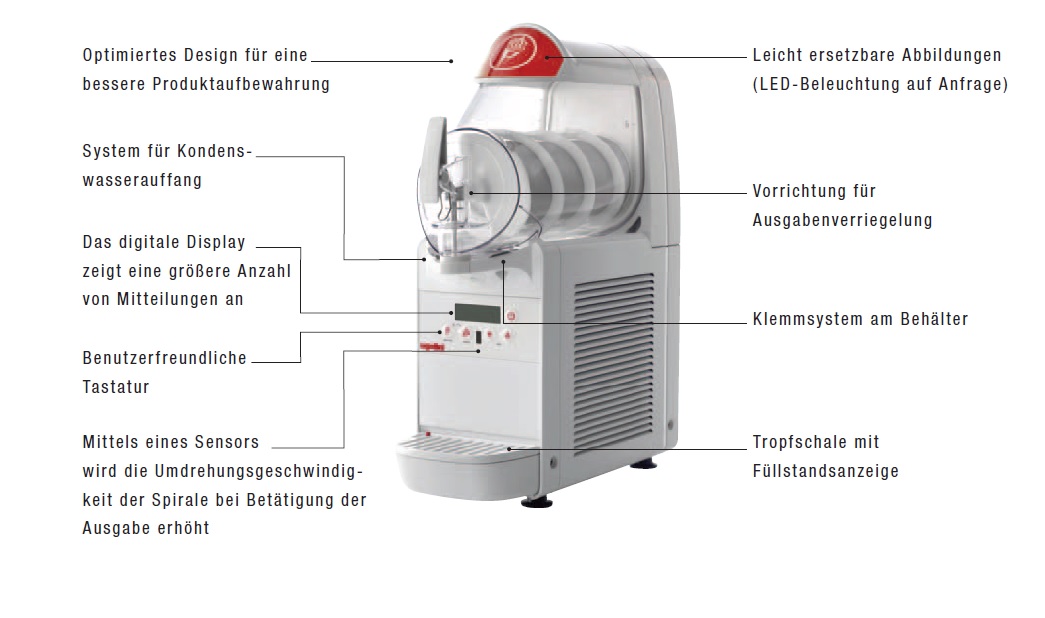 Innovatives Design trifft auf modernste Technik Mit 2,8 Litern Fassungsvermögen macht der ICON eine gute Figur in jeder Location. Dabei präsentiert er Ihre Marke werbewirksam. Die kompakte Serie ermöglicht es nun jedem leckere Frozen Drinks, Frozen Joghurts oder Smoothies anzubieten.