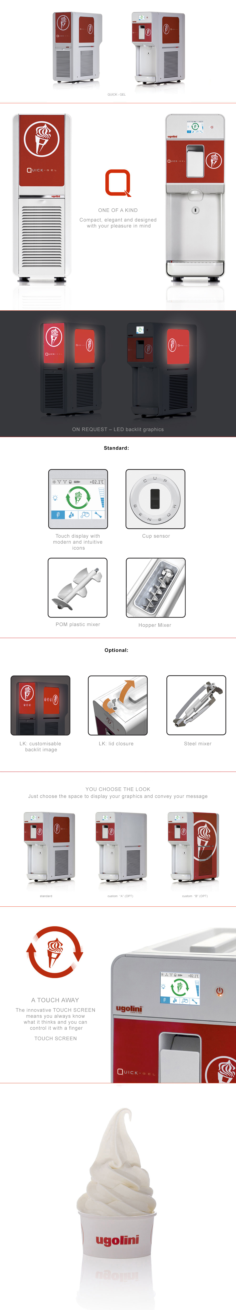 Der Quick-Gel wurde speziell für die konstante Produktion für Frozen Joghurt und andere Eisspezialitäten entwickelt. Das im 4 Ltr. Vorratsbehälter vorgekühlte Produkt wird über ein individuell einstellbares Ventil, mittels Schwerkraft, in kleinen Mengen in die 2 Ltr. Eistrommel geführt. Parallel dazu wird über das Ventil Luft in die Eistrommel geführt. In der Eistrommel wird kontinuierlich Eis hergestellt. Dieses Verfahren gewährleistet selbst an umsatzstärksten Tagen eine konstante Eisproduktion.