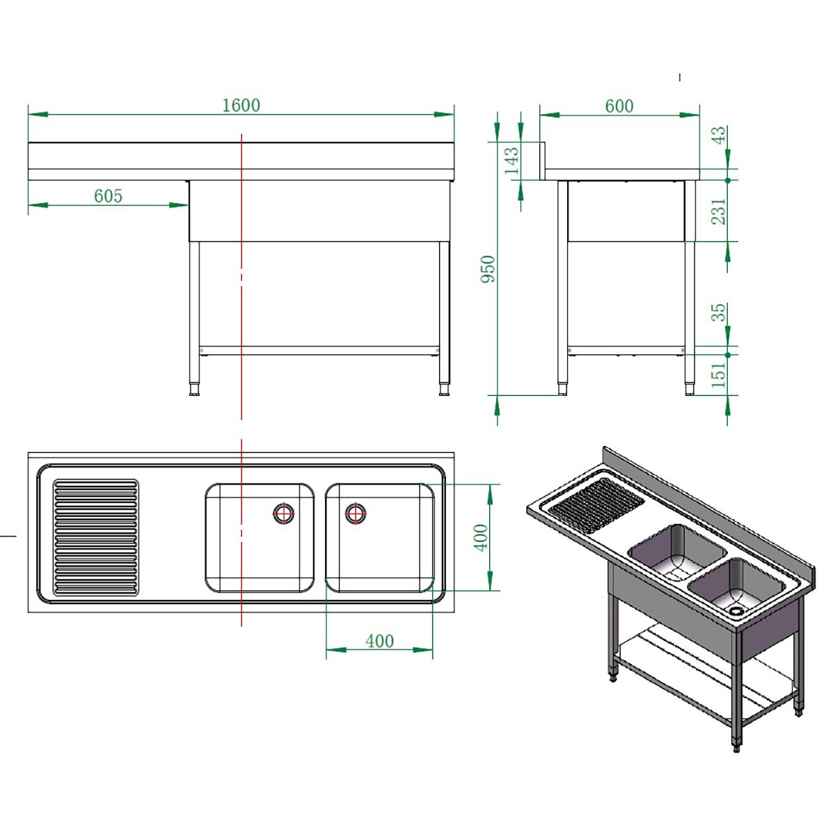 - 2 Becken 500x400x250 mm rechts und Abtropffläche