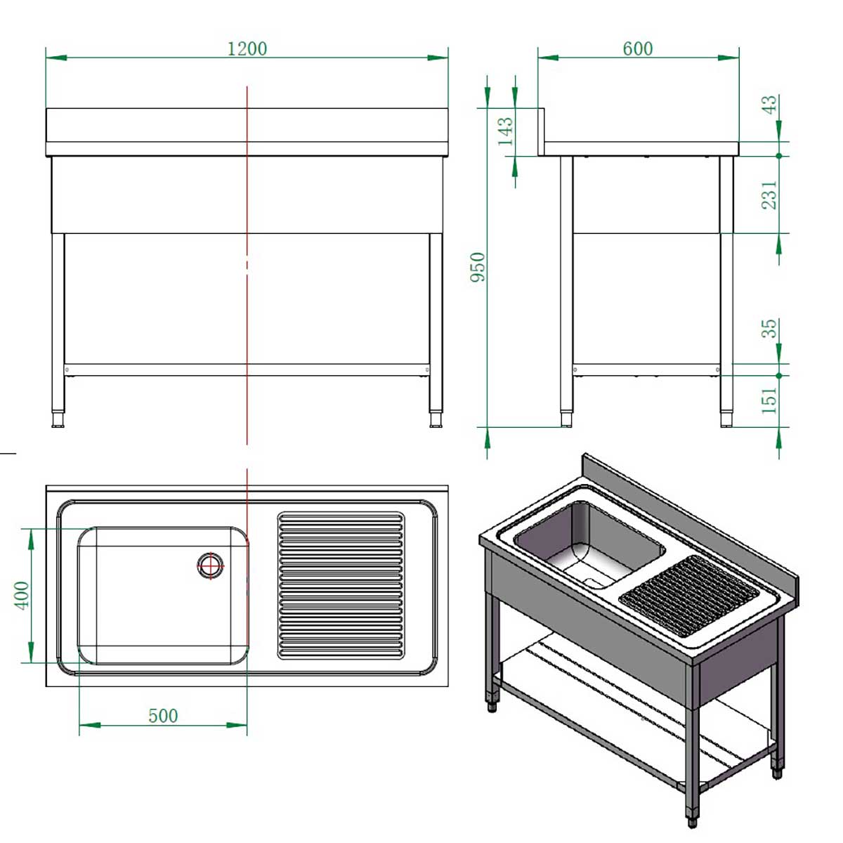 - 1 Becken 500x400x250 mm links und Abtropffläche