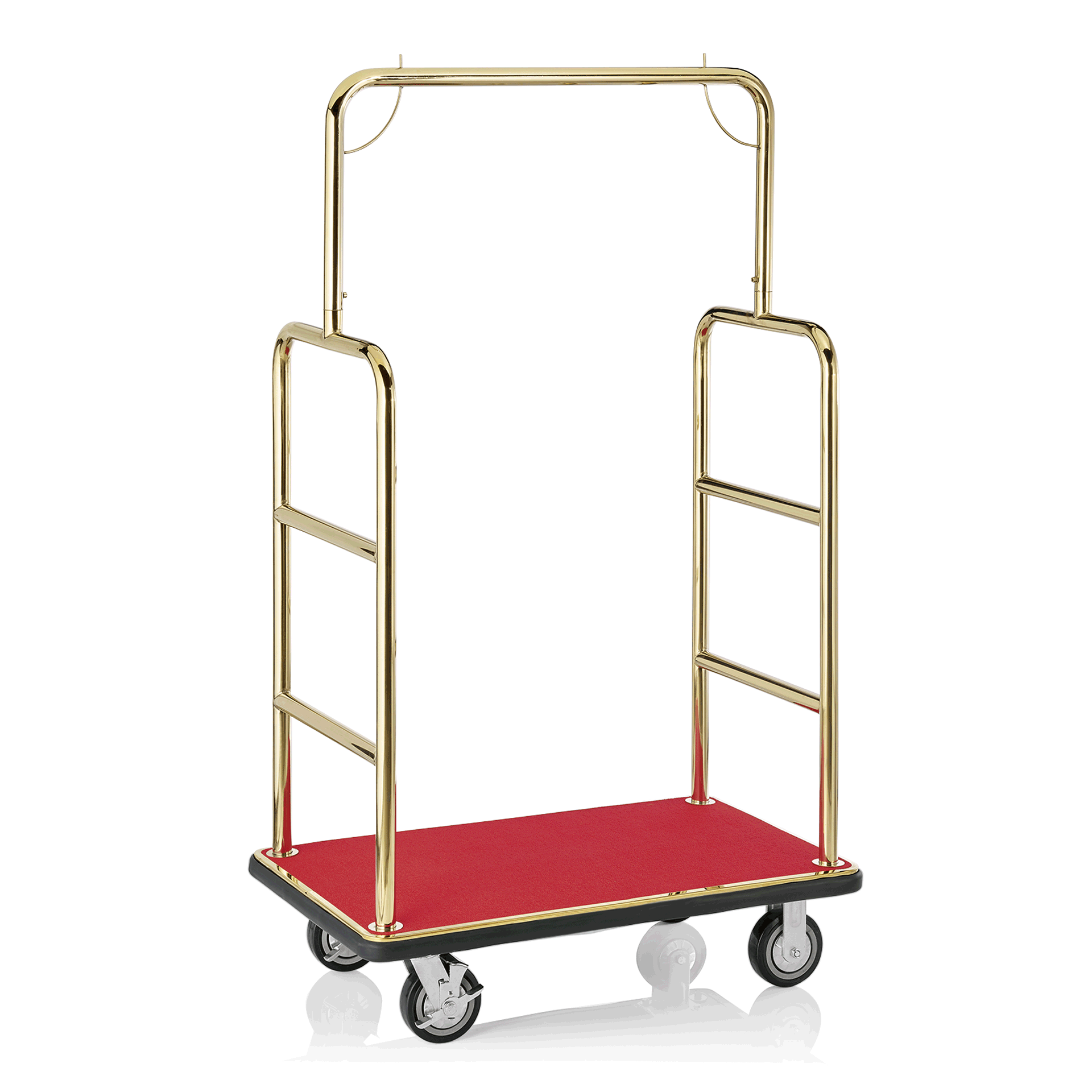 - Goldfarben, 2 schwenkbare Rollen à Ø 15 cm mit Feststeller und 2 Bockrollen, Rohrrahmen Ø 3,8 cm, integrierte Garderobenstange, umlaufendes Stoßprofil aus Gummi