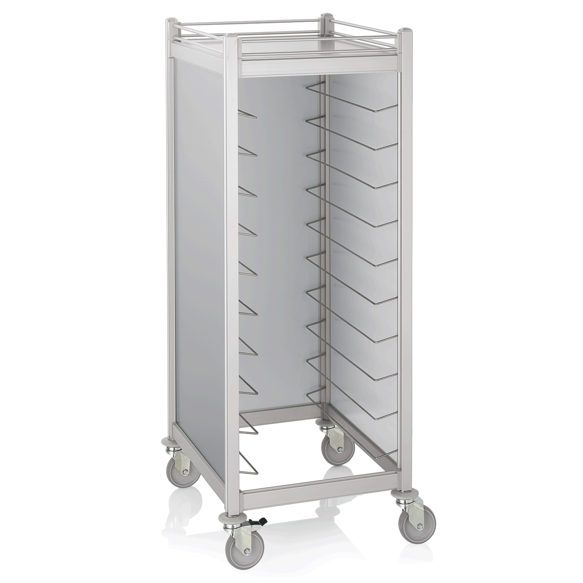 - 4 schwenkbare Rollen Ø 12 cm, davon 2 mit Feststellern, Für 20 GN 1/1 Tabletts