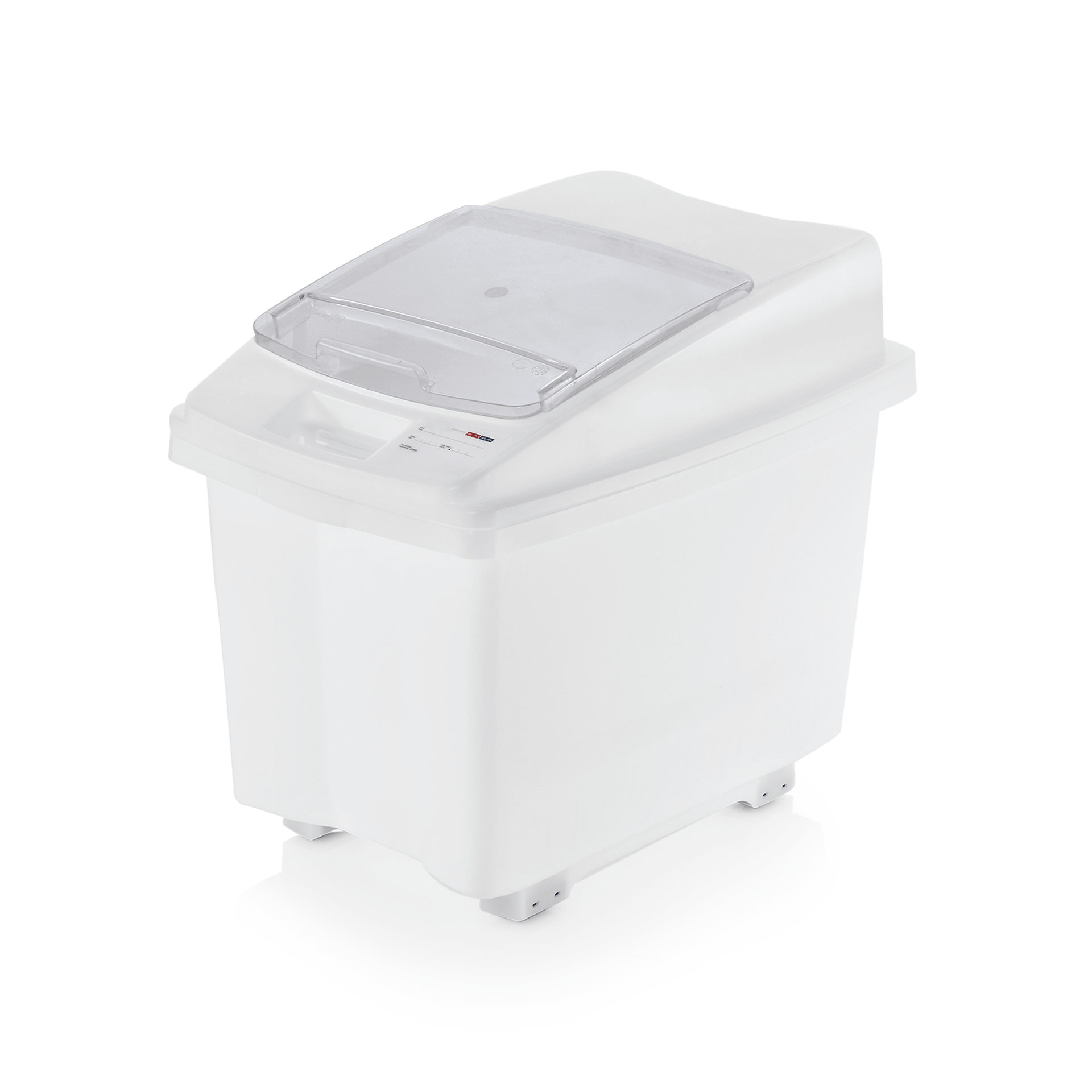 - Farbige Markierung auf dem Behälter nach HACCP möglich, mit hermetisch schließendem Deckel, NSF zertifiziert, 4 Bockrollen ohne Feststeller