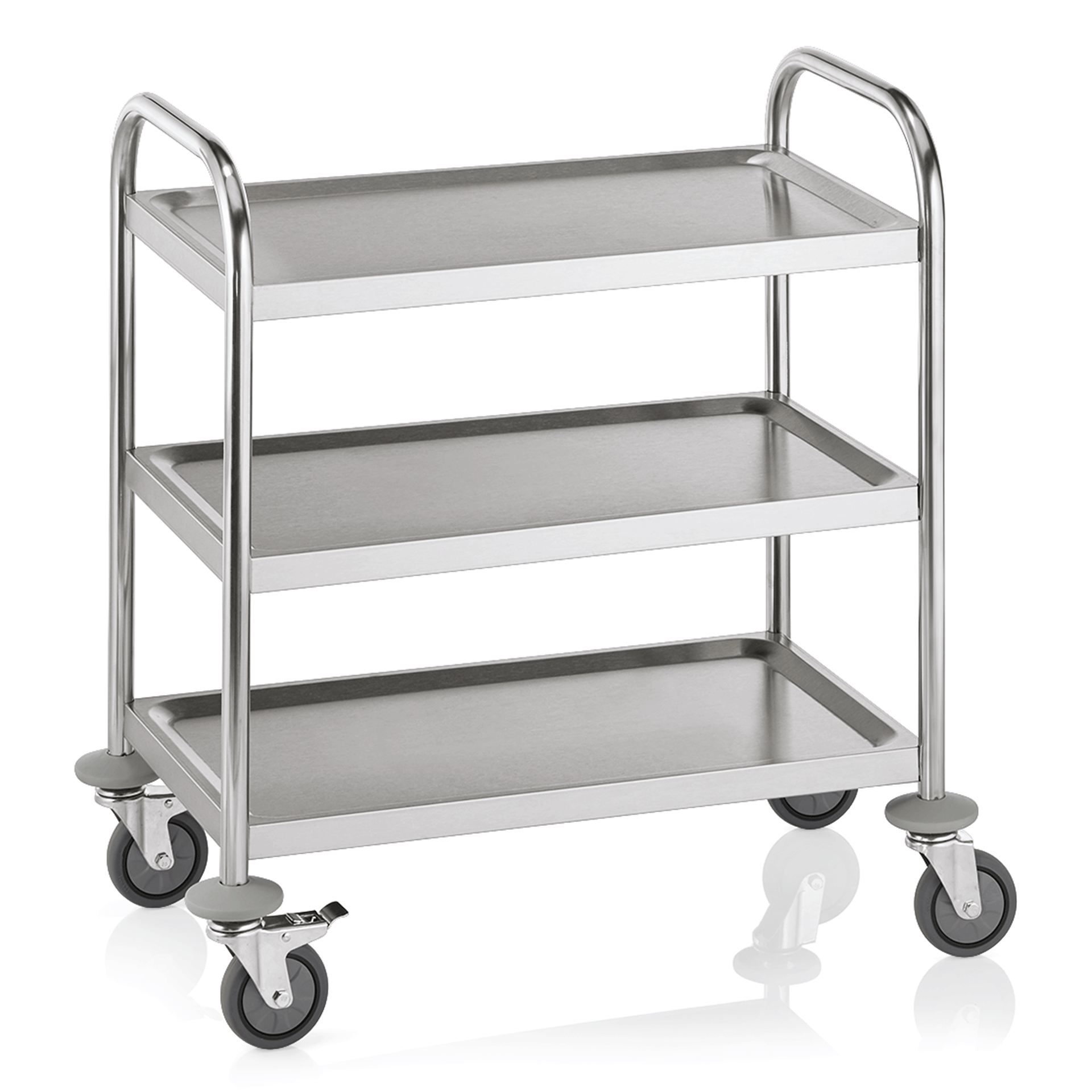 - Tragfähigkeit 30 kg pro Bord, 4 schwenkbare Rollen mit Rammschutz, davon 2 mit Feststeller, Abmessung pro Bord: 68,5 x 38,5 cm