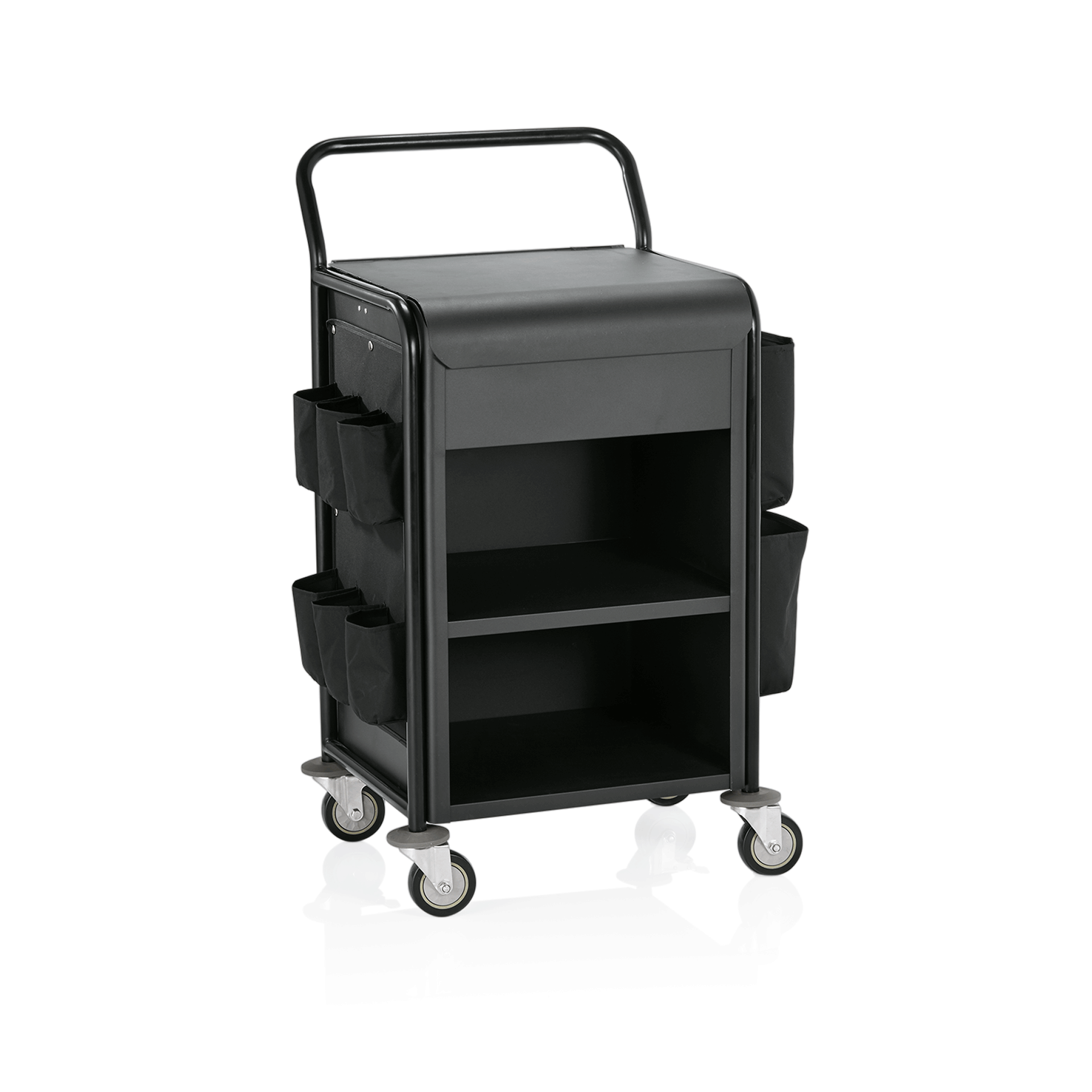 - 4 schwenkbare Rollen, davon 2 mit Feststeller, oberes Fach mit Einteilungen und Abdeckung, schwarz pulverbeschichtet