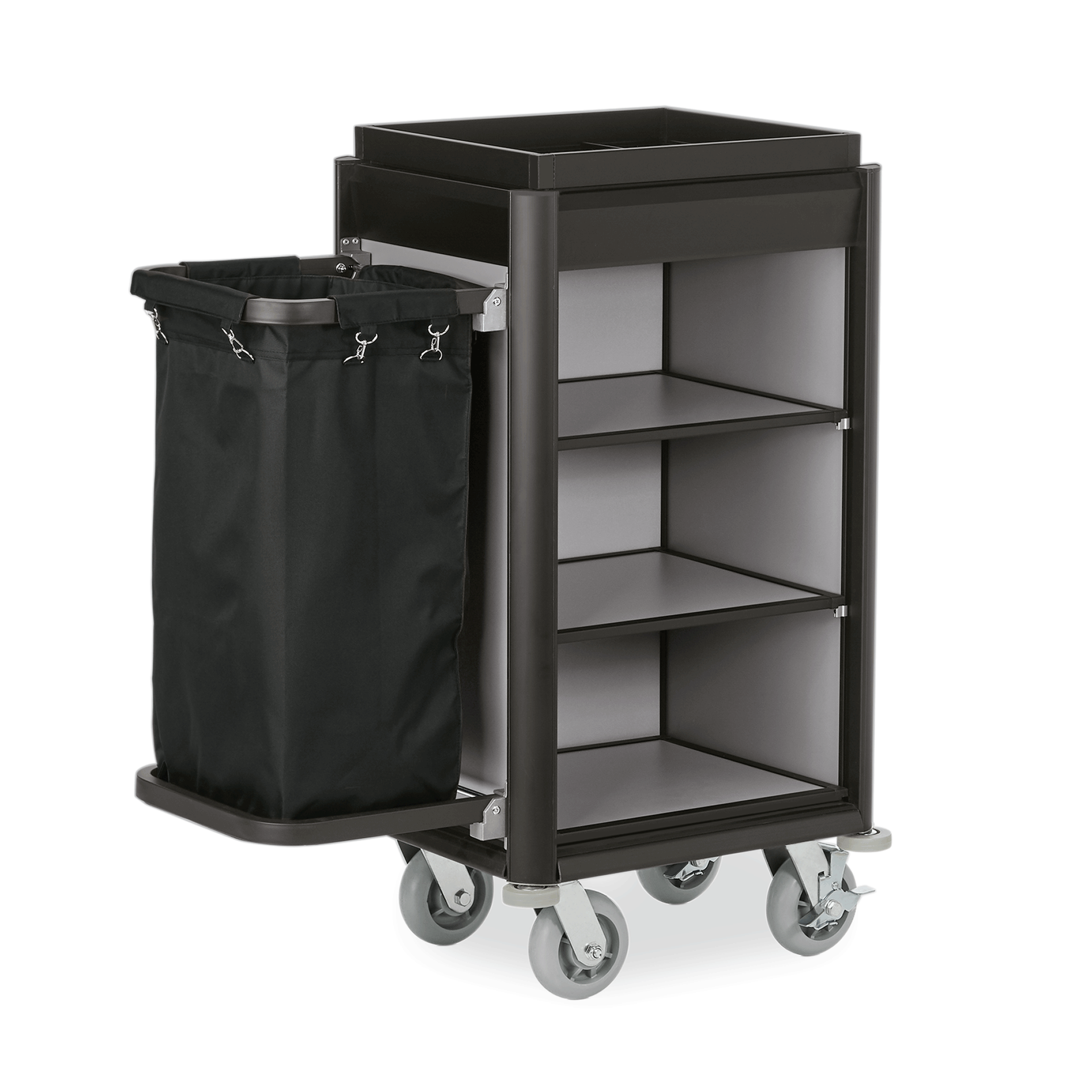 - Aufsatzrahmen aus Aluminium mit variablen Einteilungen, Kantenprofile aus Aluminium, Borde und Seitenteile aus MDF, Abmessungen: Borde bei 001: 50 x 44 cm, Borde bei 002: 72 x 44 cm, Abmessungen bei eingeklappten Wäschesäcken: Länge bei 001: 64 cm, Länge bei 002: 90 cm, 2 schwenkbare Rollen à Ø 15 cm, mit Feststeller und 2 Bockrollen, Abweisrollen, Schwarze Kantenprofile und Aluoptik