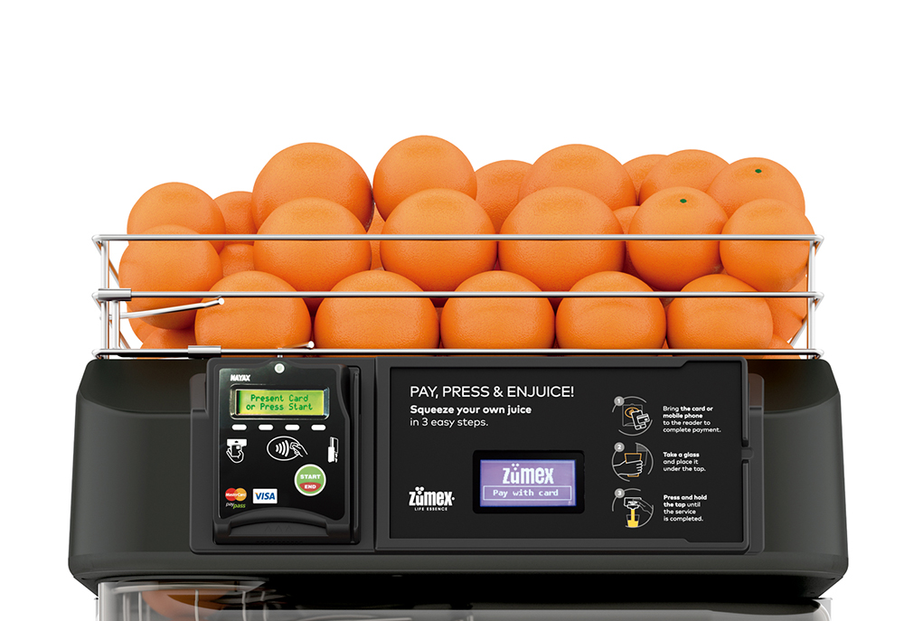 So automatisch, dass der Kunde alles selbst machen kann: bezahlen, Saft einschenken und genießen. Mit Kartenzahlung, unabhängig von der Art der Karte, damit niemand ohne Saft dasteht. Nayax-Zahlungssystem mit 4 Zahlungsarten: Magnetstreifen, Chip, MIFARE oder Contactless. Und für diejenigen, die ihre Karten lieber zu Hause lassen und nur ihr Handy benutzen, gibt es Apple Pay, Samsung Pay, Google Pay … Wenn Sie sich sorgen, dass ein Kunde nicht weiß, wie man das System benutzt, keine Angst: die Versatile Pro zeigt die 3 Schritte an, die zu befolgen sind, und begleitet den Benutzer durch den Prozess, sodass sich jeder auskennt. Außerdem werden Sie benachrichtigt, wenn Sie die Saftpresse reinigen und den Abfall entleeren müssen. So intelligent ist das Gerät: Es erkennt, wenn der Deckel oder die Saftschale geöffnet wird, es zählt die Orangen, sodass Sie programmieren können, wie viele Orangen bei jedem Vorgang ausgepresst werden, es hat ein Passwort für den Bediener … und es unterstützt Module, mit denen Sie noch mehr Nutzungsdaten bekommen. Ideal für das Anbieten von frisch gepresstem Saft in Self-Service Bereichen, Büros oder Coworking-Spaces.