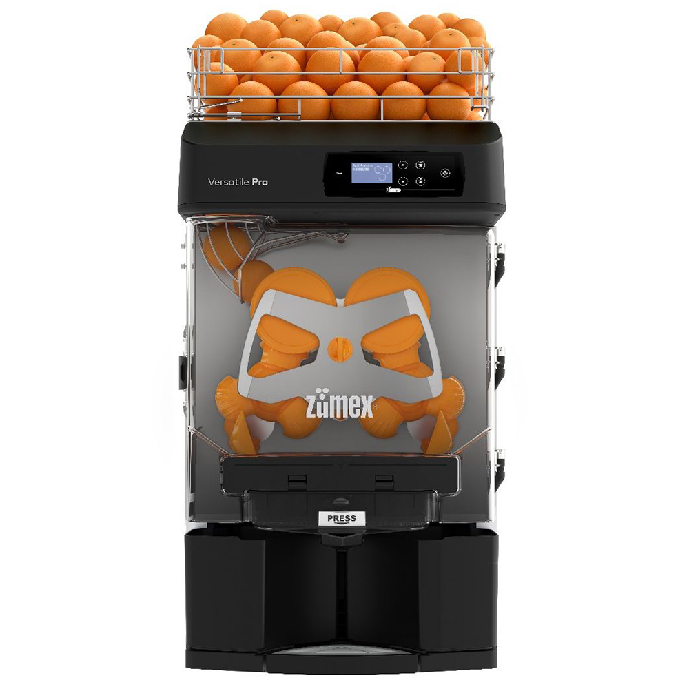 Die Versatile Pro, mit umfassenden Funktionen und sehr einfach zu bedienen. Dank der Kapazität ihrer Zuführung (16 kg), mit einer Fronttür, die das Nachfüllen von Obst erleichtert, haben Sie maximale Autonomie auf kleinstem Raum. Sie verfügt über das neue Pulp-Out-System, mit dem Sie mehr Obst ohne Unterbrechung auspressen können. Bis zu 150 kg. Mit dem mitgelieferten 1Step M-Set können Sie die Quetschgruppe mit antibakterieller ASP®-Technologie in nur einem Schritt entfernen. Außerdem ist sie spülmaschinenfest. Hygiene und Komfort sind in Ihrer Hand. Und mit dem S-Set können Sie Ihren Kunden Limetten und Zitronensaft zur Verfügung stellen. Schalten Sie zwischen den beiden Betriebsarten „Self-Sevice“ und „Professional“ um und stellen Sie die Anzahl der Früchte pro Saft auf der Digitalanzeige ein. Je nach Bedarf stehen zwei Modelle zur Auswahl: Das Tischmodell für Cafés und Gastgewerbe-Ketten und das All-in-One-Modell mit Podium und einem Fassungsvermögen von 52 Litern für Self-Service Bereiche in Hotels, Tankstellen, Supermärkten oder Obstläden.
